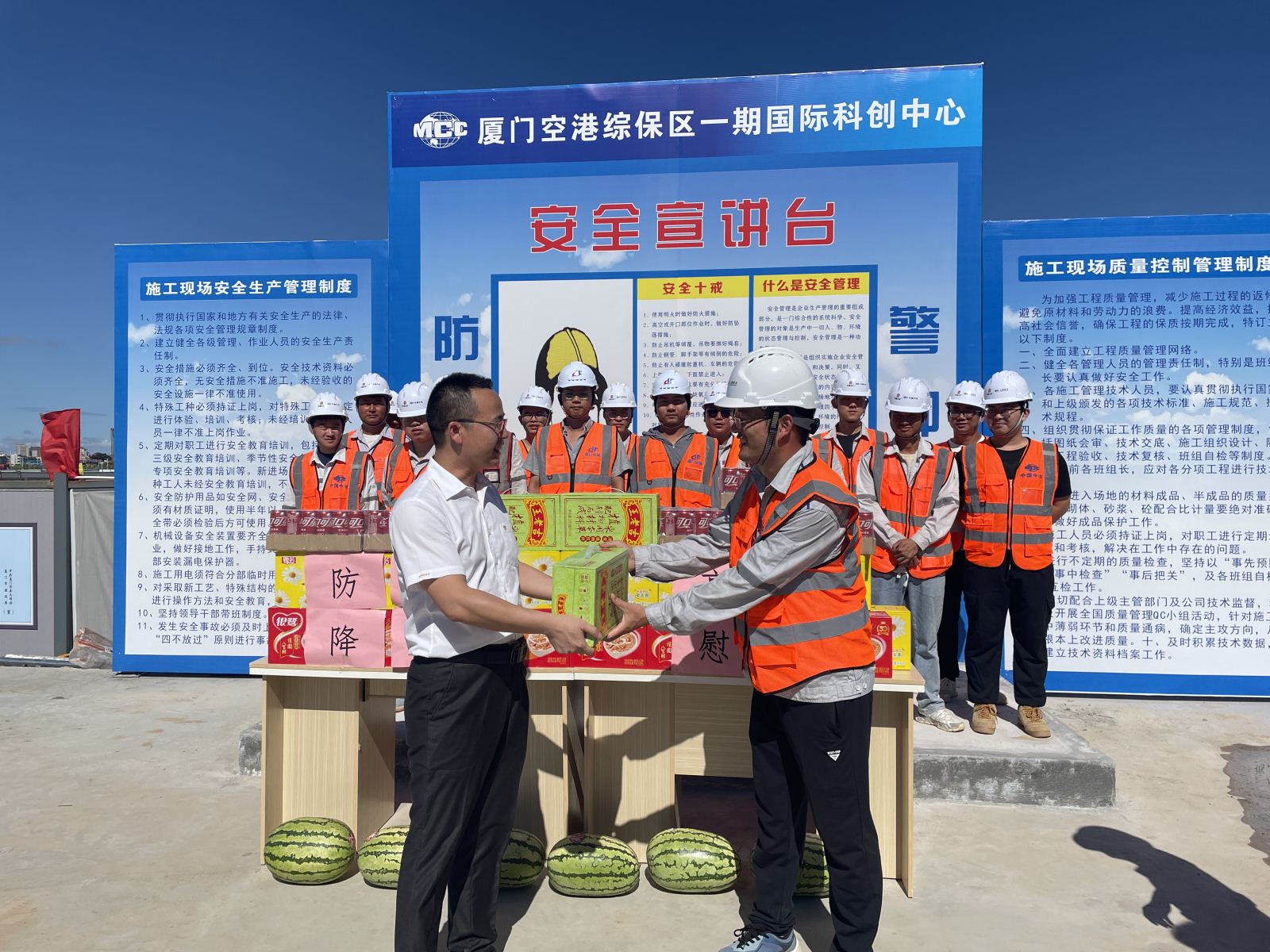 7月31日,公司党委副书记、纪委书记、工会主席朱祥祯一行先后赶赴厦门汽车城二期、厦门空港综保区一期先进智造中心、厦门空港综保区一期国际科创中心、厦门综合航空培训基地项目现场,慰问在高温环境下工作在一线的员工,为他们送上夏日清凉防暑慰问品,对依然坚守岗位、默默奉献的项目一线员工们表示衷心感谢,特别嘱咐大家要注意防暑降温,在保证工程质量和进度的同时,确保安全和健康。