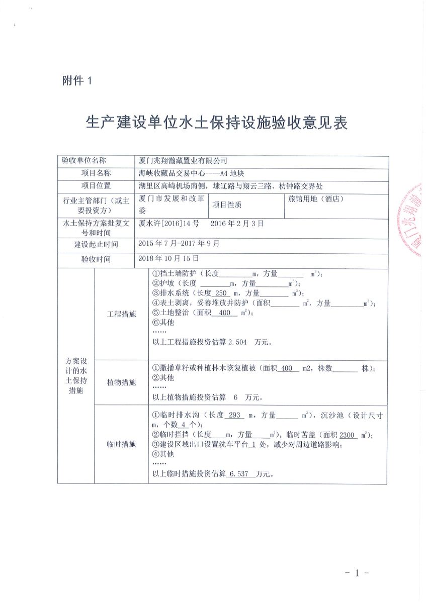 海峡收藏品交易中心-A1A3G1地块《生产建设单位水土保持设施验收意见表》