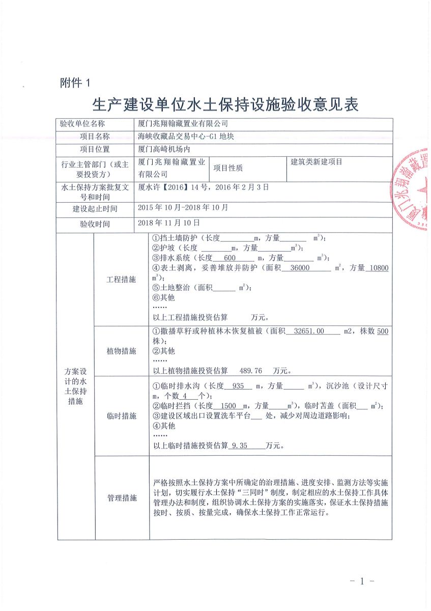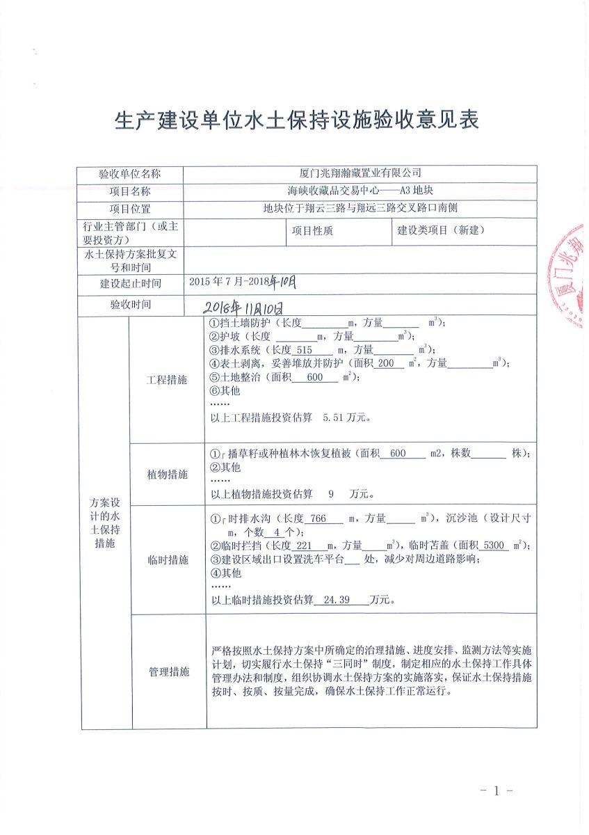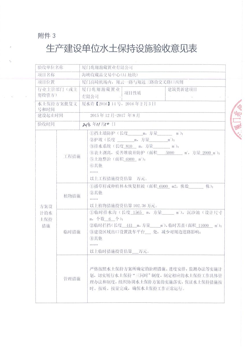 海峡收藏品交易中心-A1A3G1地块《生产建设单位水土保持设施验收意见表》